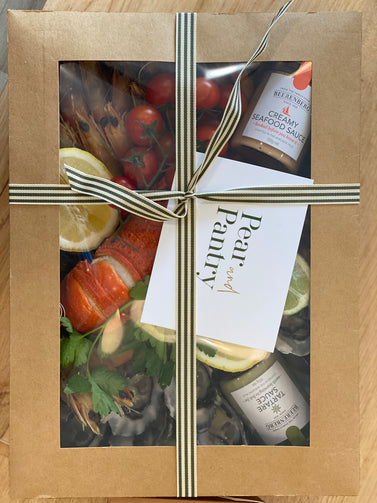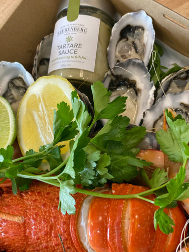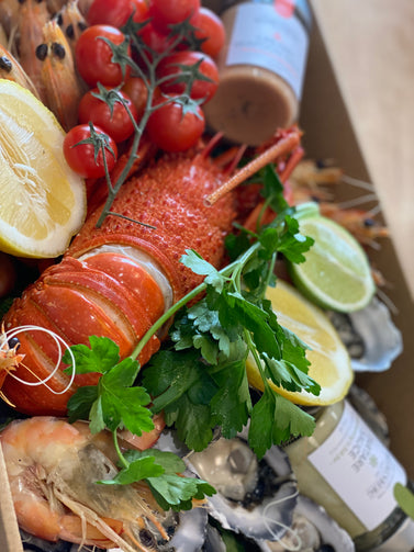 This Graze box contains 1 x 800g crayfish, 1kg whole cooked prawns, 1 dozen oysters, seafood & tartare sauces and lemon & limes.